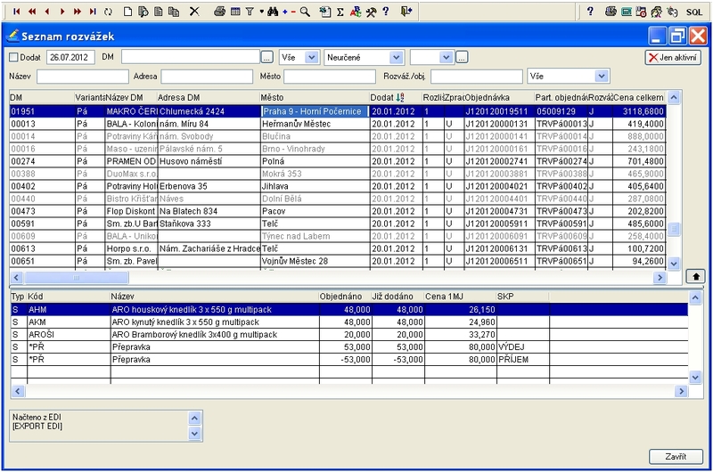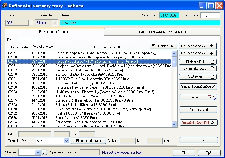 - Možnost definovat si trasy s dodacími místy. Trasy lze definovat i ve variantách (pondělí .. neděle, svátky).