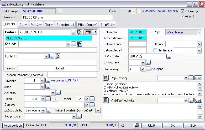 - příjem zakázek s automatickým předvyplněním údajů o vozidle v případě, že vůz již autoservis navštívil